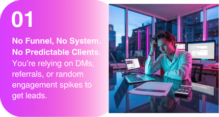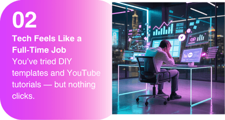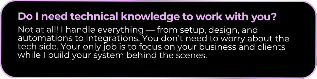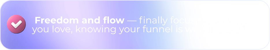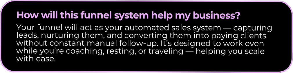 Imagine a system that works for you 24/7 — capturing leads, booking calls, and turning interest into clients — while you focus on what you love: coaching, creating, or even resting. No tech overwhelm. No guessing. Just a system that supports you.