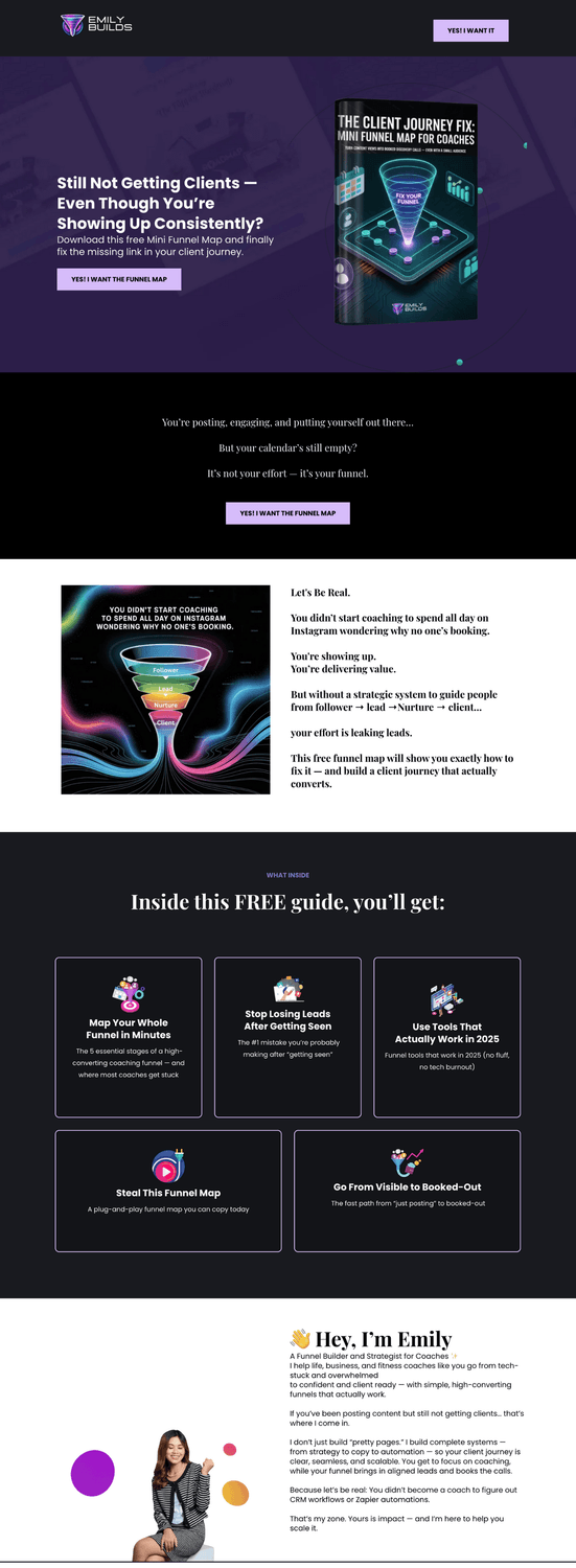 Hey, I’m Emily — Funnel Builder & Automation Strategist for Coaches. I help purpose-driven coaches build systems that attract clients, automate sales, and scale with ease — without the tech overwhelm.