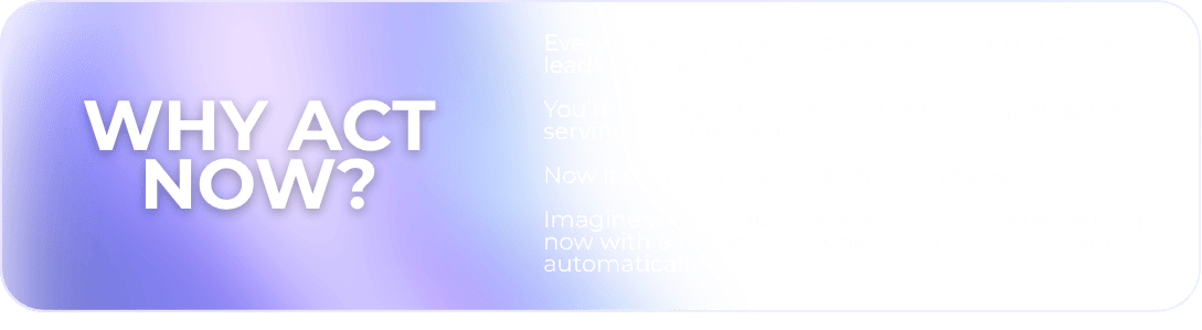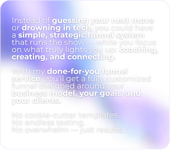 Imagine a system that works for you 24/7 — capturing leads, booking calls, and turning interest into clients — while you focus on what you love: coaching, creating, or even resting. No tech overwhelm. No guessing. Just a system that supports you.